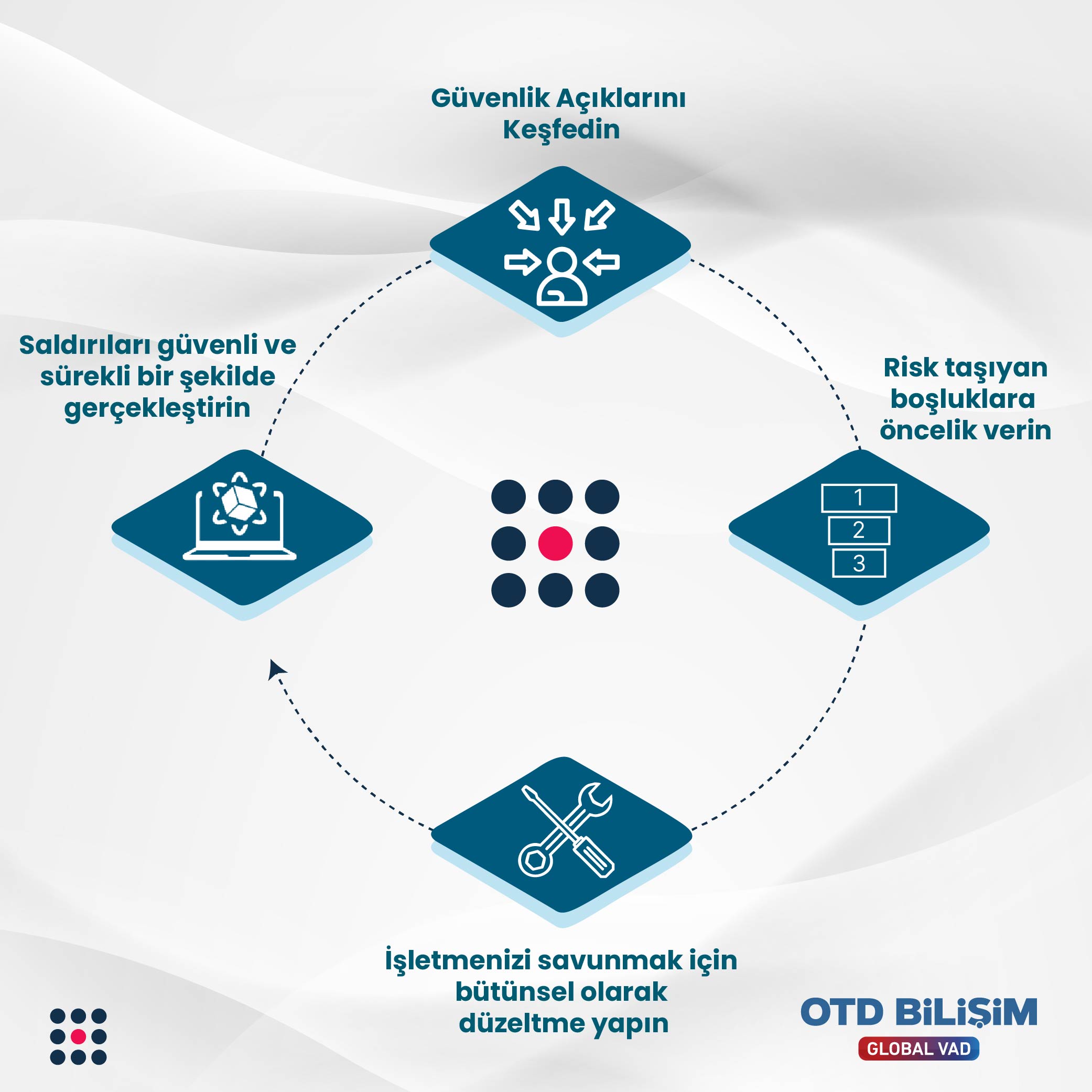 Test sonuçlarını sade, yapılandırılmış raporlarla sunar. Her rapor; açık bulgular, etki analizi ve önerilen aksiyon adımlarını içerir. Yönetim ekibi için stratejik, teknik ekip için ise operasyonel olarak anlamlı çıktılar sağlar.