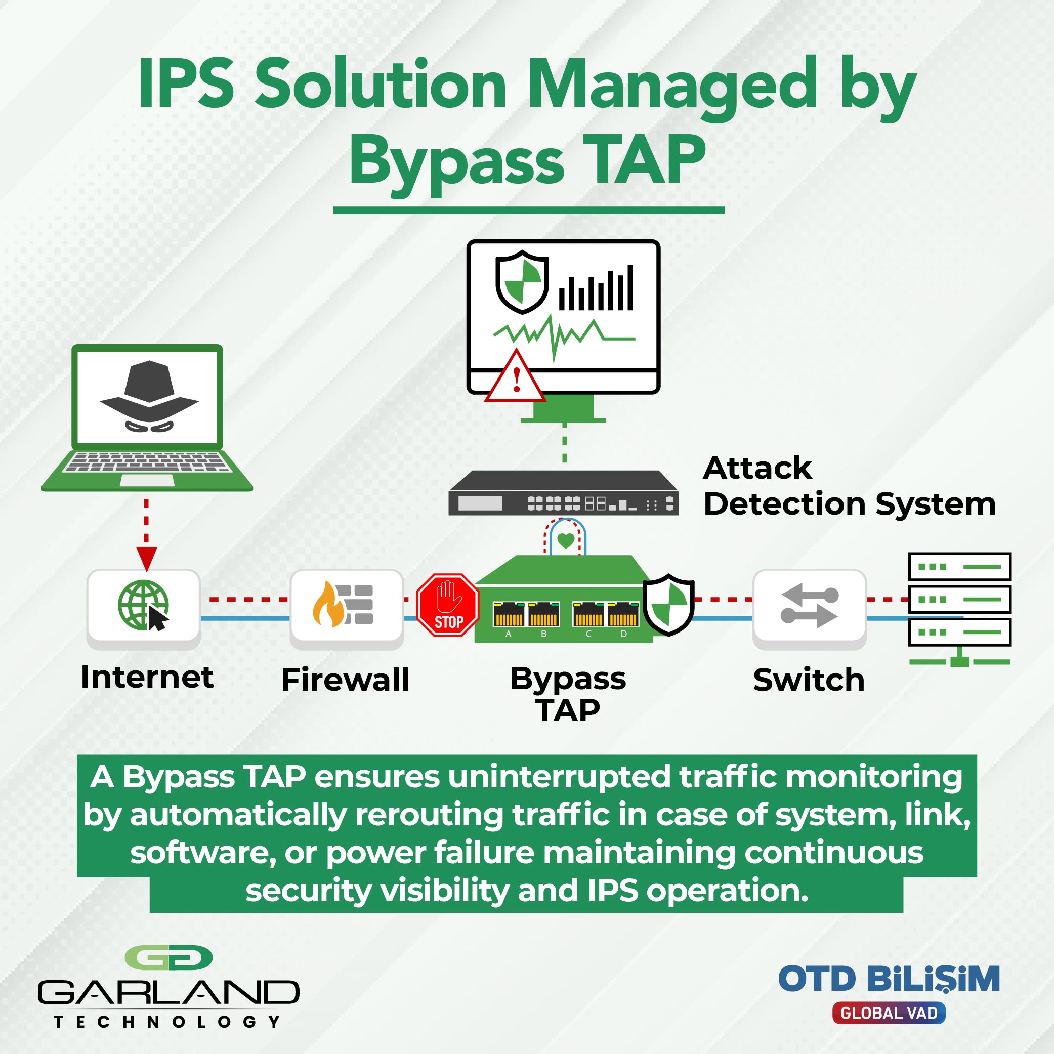 Although internal bypass add-ons in IPS solutions may work in some failure scenarios, due to being software-based, they cannot close additional security vulnerabilities and do not provide the flexibility required during maintenance. Garland Technology's Bypass TAP solutions overcome these limitations, continuously ensuring the reliability of inline devices such as IPS, WAF, or firewall. Updates, patches, or troubleshooting processes easily allow you to take devices offline, thereby minimizing network downtime. Additionally, by eliminating single points of failure, it secures traffic flow and optimizes the performance of inline devices. This approach enables organizations to maintain operational continuity and makes their security strategies more resilient and scalable.